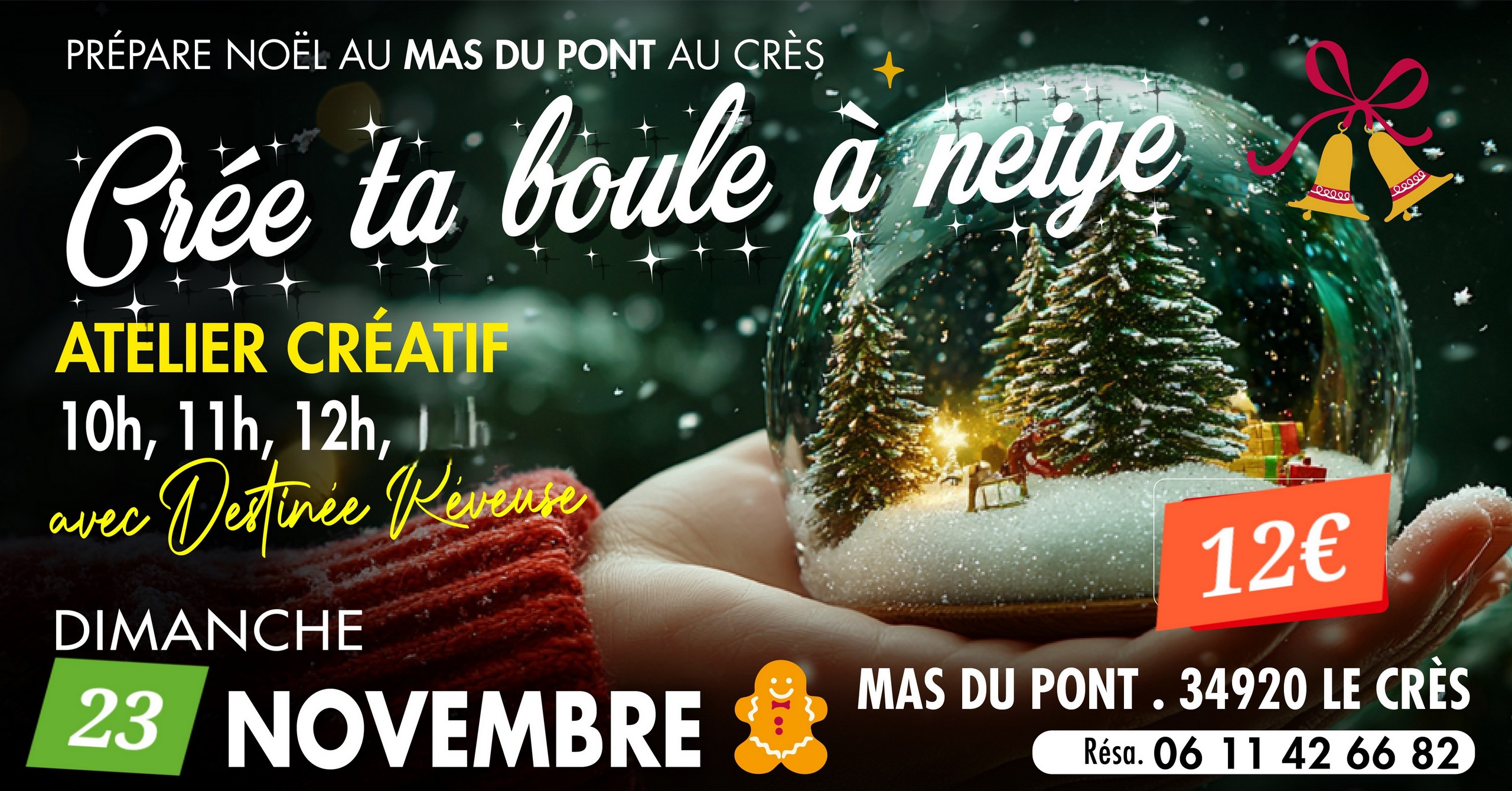 👋 Rendez-vous au Mas du Pont au Crès le dimanche 23 novembre. En attendant Noël, créez et repartez avec votre magnifique boule à neige !